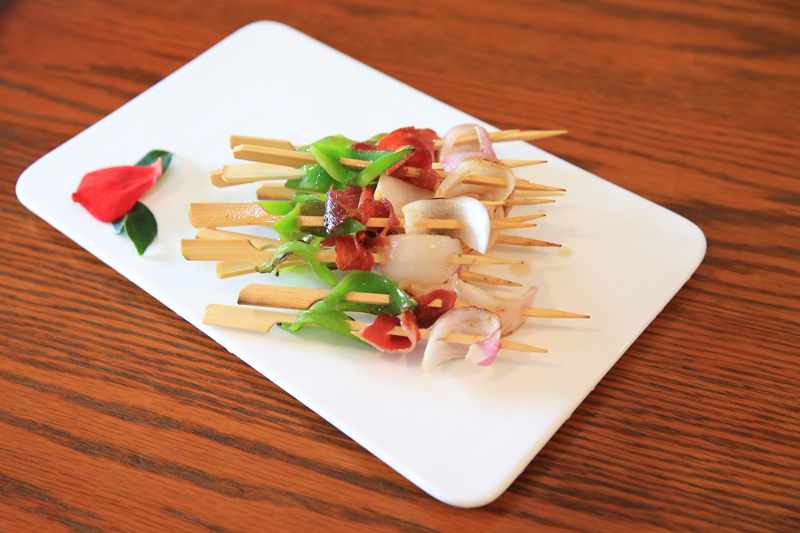 點(diǎn)評(píng):其實(shí),火腿一般很少有人拿來煎或者炸,但因?yàn)榘僮兓鹜认鄬?duì)比較軟,而且咸度低,所以小潘大膽地做了這樣的嘗試。只是要提醒大家,在炸的過程中,要掌握好時(shí)間,以免洋蔥、甜椒等過熟失去原有的脆感和甜度。從整道菜來說,洋蔥和甜椒的清甜味中和了火腿的鮮味,配合得剛剛好,竹簽元素也讓它頗具樂趣。